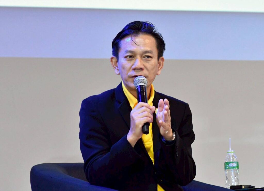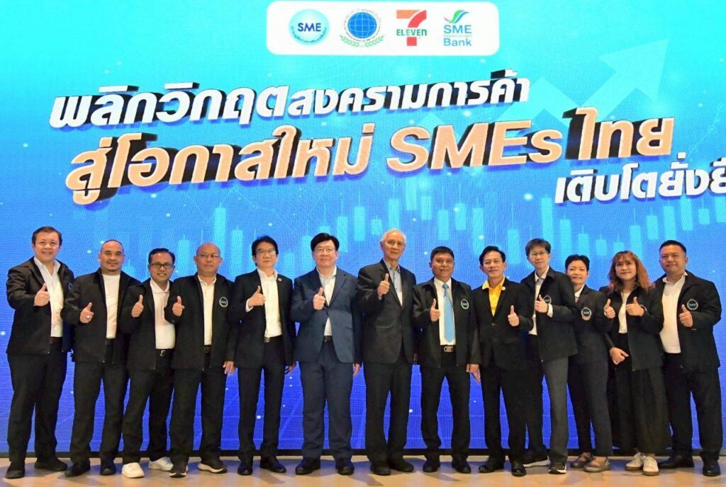 เมื่อวันที่ 30 กรกฎาคม 2568 ณ ชั้น 6 ห้องออดิทอเรียม อาคารอีสต์ ทรู ดิจิทัล พาร์ค สมาคมผู้สื่อข่าวส่งเสริมเอสเอ็มอีไทย ร่วมกับ สมาคมการค้าปลีกและเอสเอ็มอีทุนไทย SME D Bank, ธนาคารพัฒนาวิสาหกิจขนาดกลางและขนาดย่อมแห่งประเทศไทย (SME D Bank) และ ร้านสะดวกซื้อ 7-Eleven จัดเสวนาหัวข้อ “พลิกวิกฤตสงครามการค้า สู่โอกาสใหม่ SMEs ไทยเติบโตยั่งยืน” เพื่อเสริมสร้างองค์ความรู้ มุมมอง และแนวทางที่เป็นประโยชน์ต่อผู้ประกอบการเอสเอ็มอี ในการเผชิญหน้ากับสถานการณ์ที่ท้าทายในปัจจุบัน โดยมี รศ.ดร.สมภพ มานะรังสรรค์ อธิการบดี สถาบันการจัดการปัญญาภิวัฒน์ ผู้เชี่ยวชาญด้านจีนศึกษาชั้นแนวหน้าของประเทศไทย, นายสุวิทย์ กิ่งแก้ว นายกสมาคมการค้าปลีกและเอสเอ็มอีทุนไทย และ นายอนุพงษ์ แสงอรุณทอง ผู้ช่วยกรรมการผู้จัดกา SME D Bank ร่วมเสวนา โดยมีผู้สนใจทั้งผู้ประกอบการเอสเอ็มอี, นักเรียนนิสิตนักศึกษา และสื่อมวลชน เข้าร่วมรับฟังเป็นจำนวนมาก